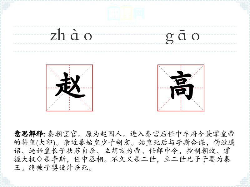 1.秦朝宦官。原为赵国人。进入秦宫后任中车府令兼掌皇帝的符玺(大印)。亲近秦始皇少子胡亥。始皇死后与李斯合谋,伪造遗诏,逼始皇长子扶苏自杀,立胡亥为帝。任郎中令,控制朝政,掌握大权◇杀李斯,任中丞相。不久又杀二世,立二世兄子子婴为秦王。终被子婴设计杀死。