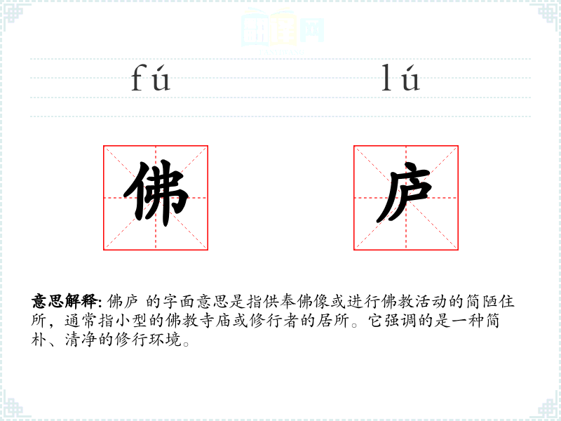 佛庐 的字面意思是指供奉佛像或进行活动的简陋住所,通常指小型的寺庙或修行者的居所。它强调的是一种简朴、清净的修行环境。