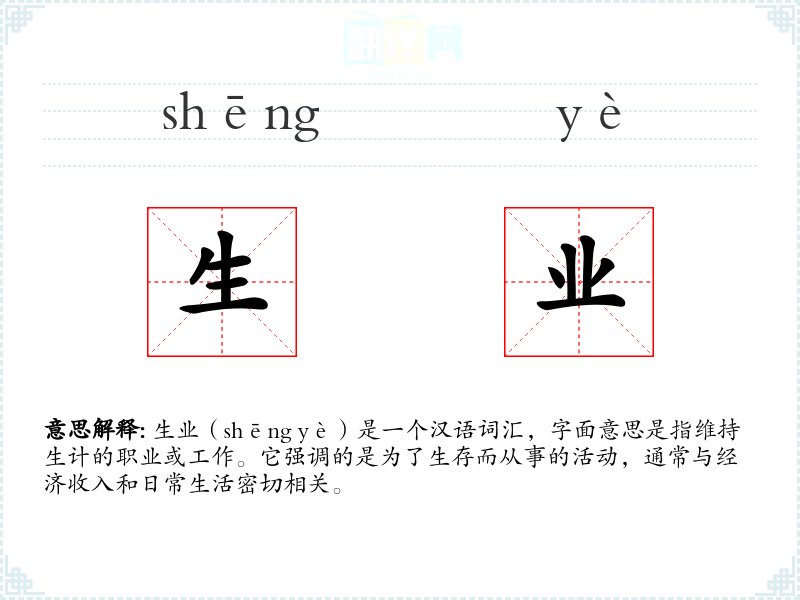 生业(shēng yè)是一个汉语词汇,字面意思是指维持生计的职业或工作。它强调的是为了生存而从事的活动,通常与经济收入和日常生活密切相关。