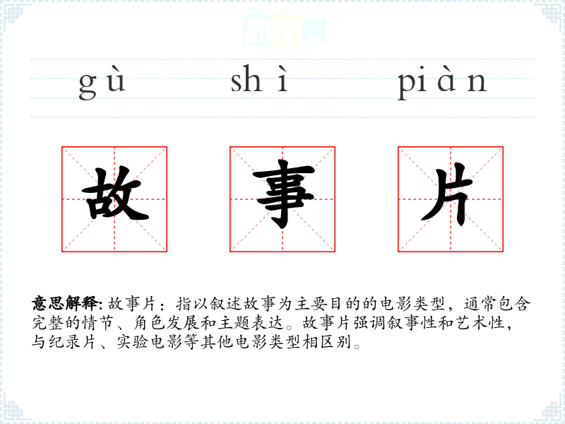 理解:故事片是电影艺术的核心形式,它通过叙事和视觉表达传递情感和思想。 重要性:在语言学习和表达中,理解故事片的概念有助于更好地欣赏和分析电影作品,同时也丰富了文化体验和交流。