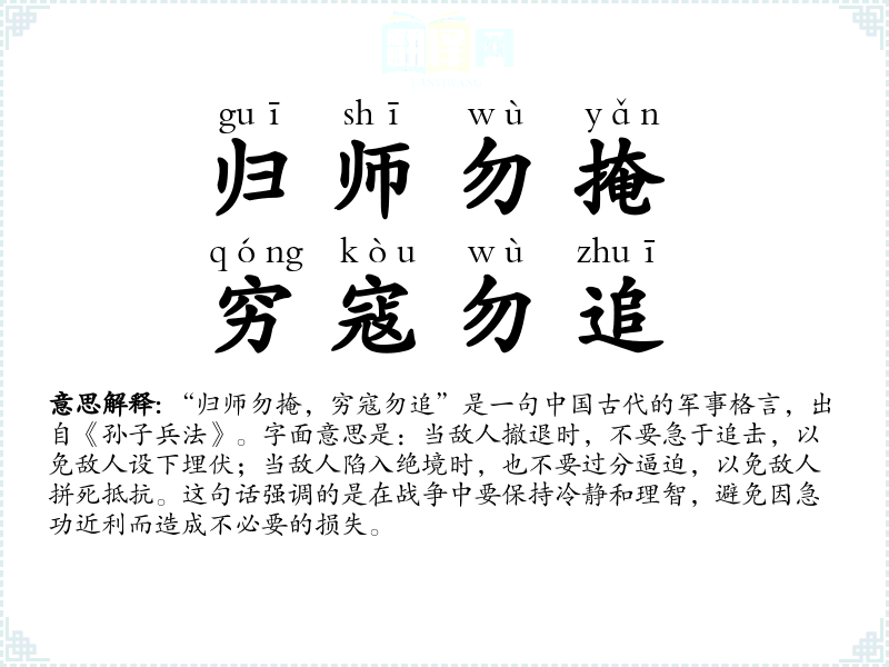 - 在处理国际关系时,我们应该遵循“归师勿掩,穷寇勿追”的智慧,避免不必要的冲突升级。