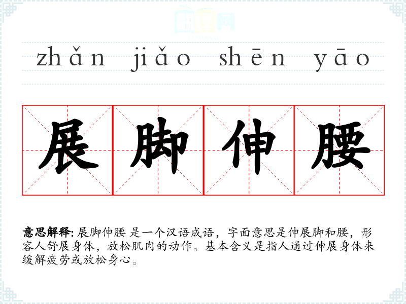 展脚伸腰 是一个汉语成语,字面意思是伸展脚和腰,形容人舒展身体,放松肌肉的动作。基本含义是指人通过伸展身体来缓解疲劳或放松身心。