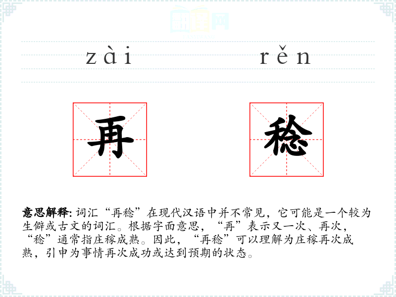 - 词源:“再”来自古代汉语,表示重复;“稔”源自“稔熟”,指庄稼成熟。