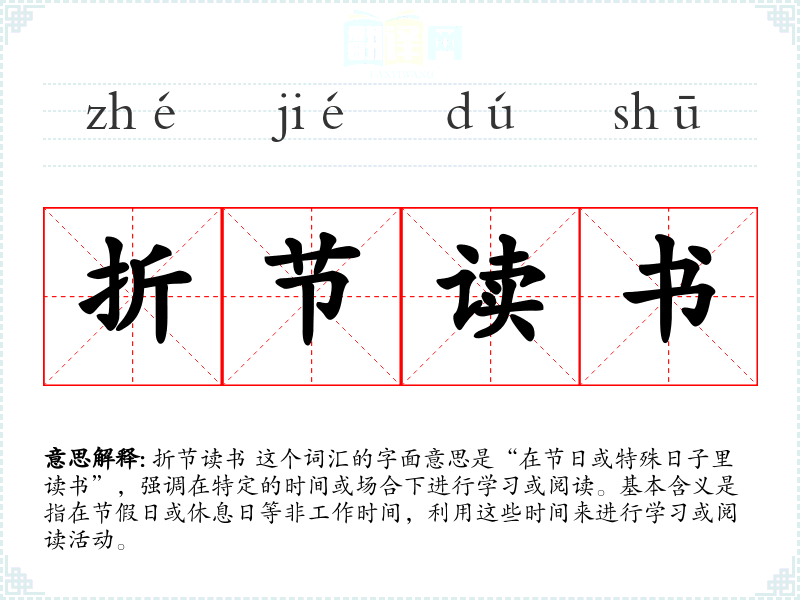 折节读书 这个词汇的字面意思是“在节日或特殊日子里读书”,强调在特定的时间或场合下进行学或阅读。基本含义是指在节假日或休息日等非工作时间,利用这些时间来进行学或阅读活动。