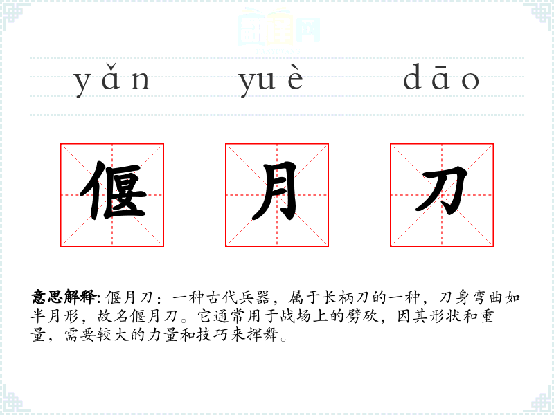- 口语:在日常口语中,偃月刀可能不常被提及,但在讨论历史或武术时,可能会作为一个文化符号出现。