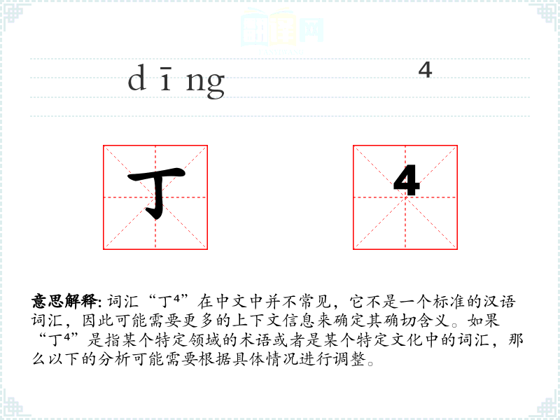 词汇“丁⁴”在中文中并不常见,它不是一个标准的汉语词汇,因此可能需要更多的上下文信息来确定其确切含义。如果“丁⁴”是指某个特定领域的术语或者是某个特定文化中的词汇,那么以下的分析可能需要根据具体情况进行调整。