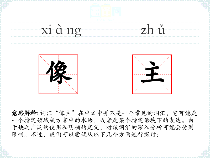 词汇“像主”在中文中并不是一个常见的词汇,它可能是一个特定领域或方言中的术语,或者是某个特定语境下的表达。由于缺乏广泛的使用和明确的定义,对该词汇的深入分析可能会受到限制。不过,我们可以尝试从以下几个方面进行探讨: