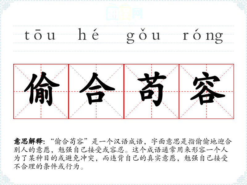 “偷合苟容”是一个汉语成语,字面意思是指偷偷地迎合别人的意愿,勉强自己接受或容忍。这个成语通常用来形容一个人为了某种目的或避免冲突,而违背自己的真实意愿,勉强自己接受不合理的条件或行为。