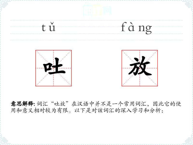 词汇“吐放”在汉语中并不是一个常用词汇,因此它的使用和意义相对较为有限。以下是对该词汇的深入学习和分析: