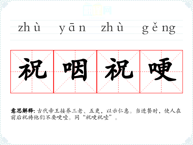 古代帝王接养三老、五更,以示仁惠。当进餐时,使人在前后祝祷他们不要哽噎。同“