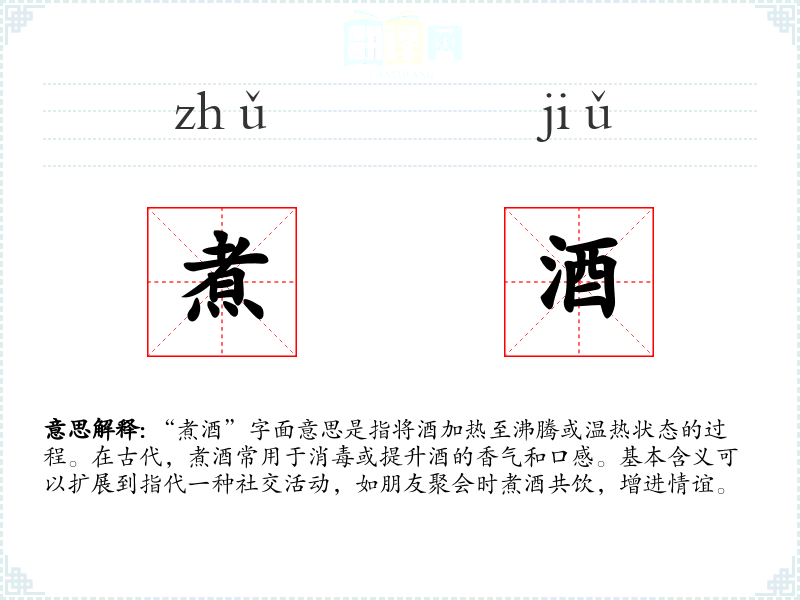 - 反义词:冷饮、冰镇。这些词汇与“煮酒”形成对比,指不加热或冷却的饮品。