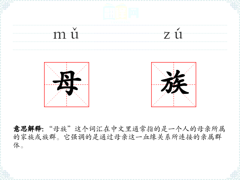 “母族”这个词由“母”和“族”两个字组成,其中“母”指的是母亲,“族”指的是一群人或家族。这个词在中文中历史悠久,主要用于描述通过母亲联系的家族或族群。