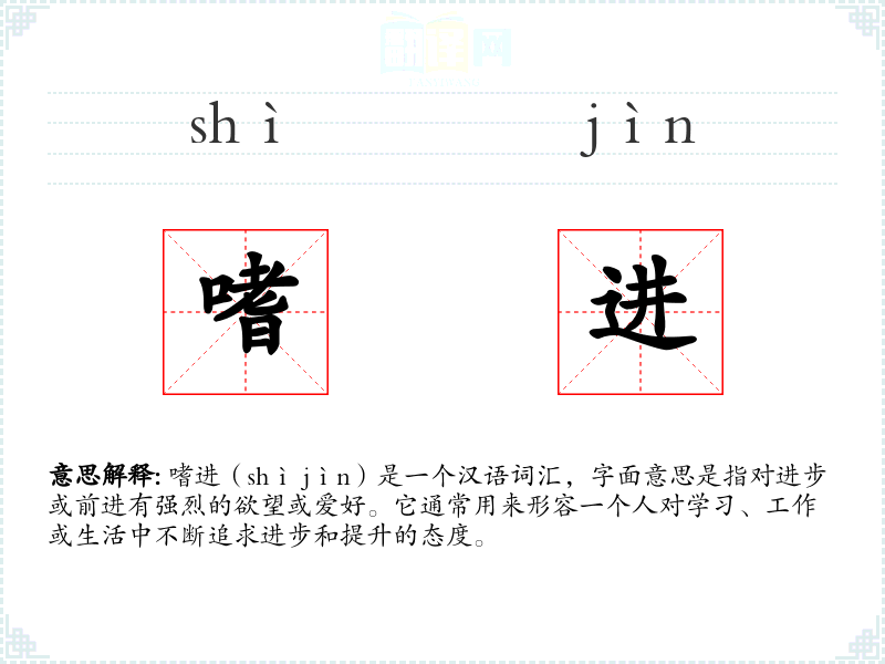 嗜进这个词由“嗜”和“进”两个字组成。“嗜”字古汉语中意为“爱好”或“喜欢”,“进”字则表示“前进”或“进步”。在古代文献中,这个词可能不常见,但随着现代社会对个人发展和进步的重视,嗜进的使用频率有所增加。