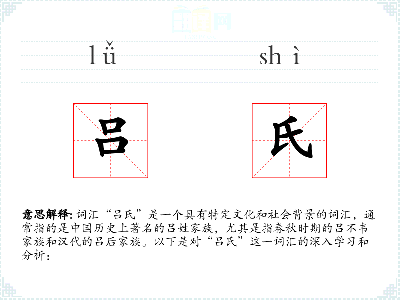 词汇“吕氏”是一个具有特定文化和社会背景的词汇,通常指的是*历史上著名的吕姓家族,尤其是指春秋时期的吕不韦家族和汉代的吕后家族。以下是对“吕氏”这一词汇的深入学和分析: