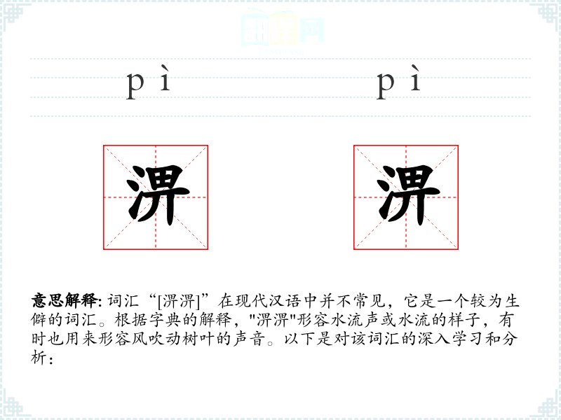 词汇“[淠淠]”在现代汉语中并不常见,它是一个较为生僻的词汇。根据字典的解释,"淠淠"形容水流声或水流的样子,有时也用来形容风吹动树叶的声音。以下是对该词汇的深入学*和分析: