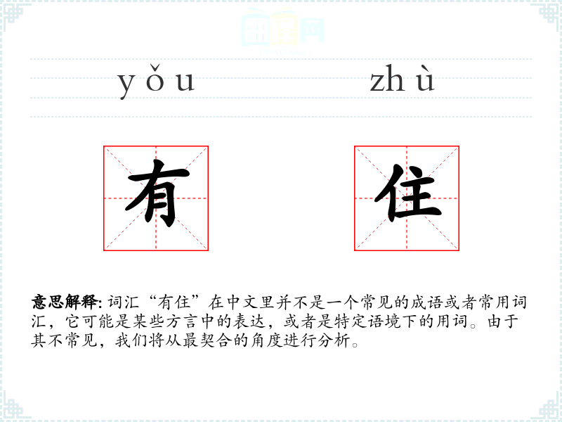 词汇“有住”在中文里并不是一个常见的成语或者常用词汇,它可能是某些方言中的表达,或者是特定语境下的用词。由于其不常见,我们将从最契合的角度进行分析。