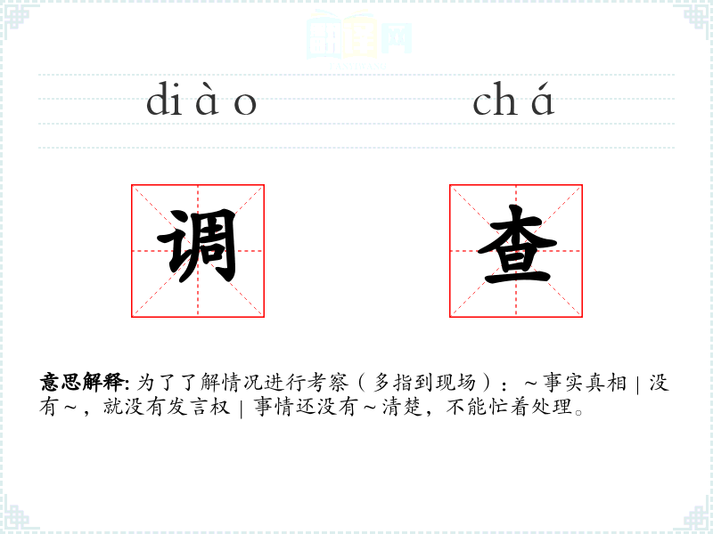 为了了解情况进行考察(多指到现场):~事实真相|没有~,就没有发言权|事情还没有~清楚,不能忙着处理。