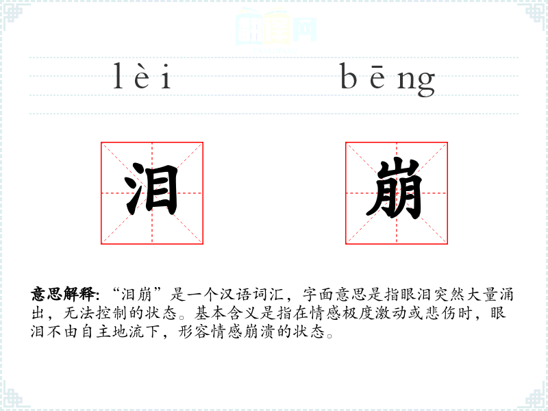 “泪崩”是一个汉语词汇,字面意思是指眼泪突然大量涌出,无法控制的状态。基本含义是指在情感极度激动或悲伤时,眼泪不由自主地流下,形容情感崩溃的状态。