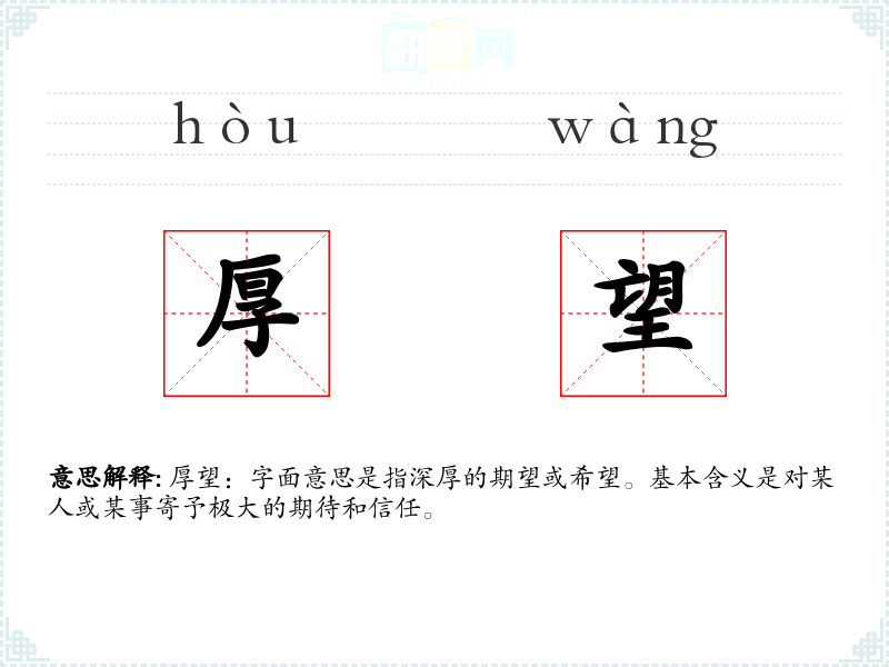 厚望:字面意思是指深厚的期望或希望。基本含义是对某人或某事寄予极大的期待和信任。
