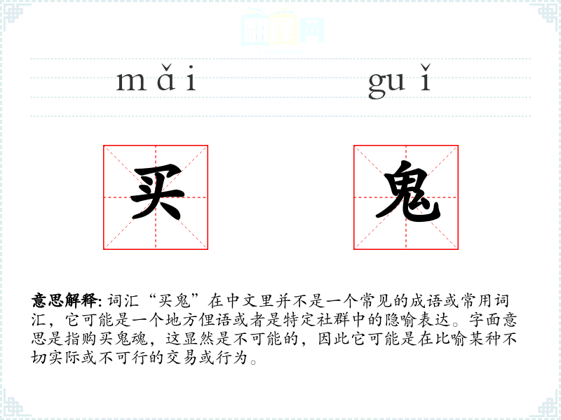 词汇“买鬼”在中文里并不是一个常见的成语或常用词汇,它可能是一个地方俚语或者是特定社群中的隐喻表达。字面意思是指购买鬼魂,这显然是不可能的,因此它可能是在比喻某种不切实际或不可行的交易或行为。