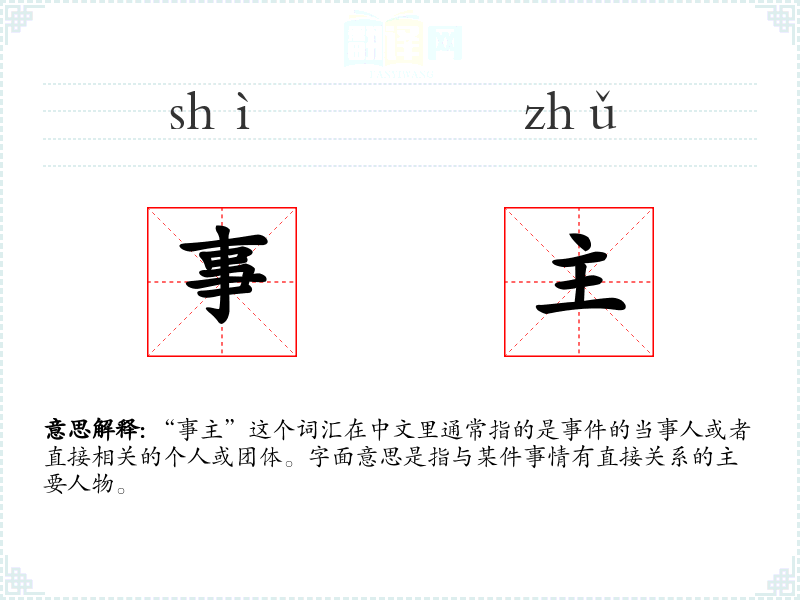 “事主”这个词汇在中文里通常指的是**的当事人或者直接相关的个人或团体。字面意思是指与某件事情有直接关系的主要人物。