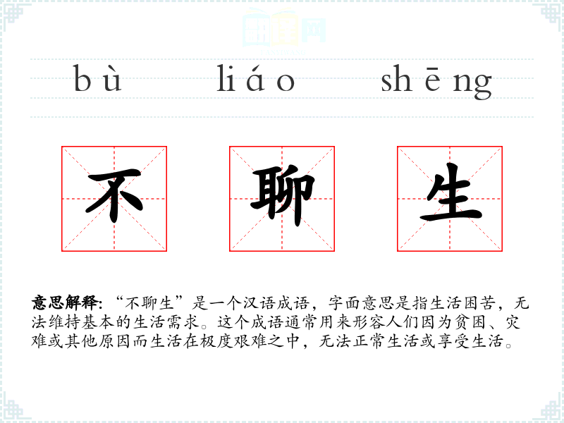 - 文学语境:在文学作品中,“不聊生”常用来描绘社会底层人物的悲惨生活,如在古代诗词或现代小说中描述贫民窟的生活状态。