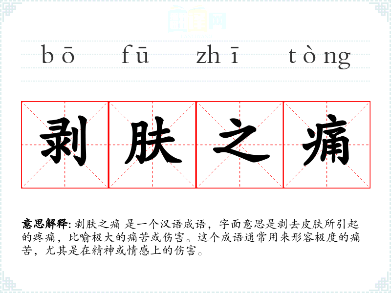 剥肤之痛 是一个汉语成语,字面意思是剥去皮肤所引起的疼痛,比喻极大的痛苦或伤害。这个成语通常用来形容极度的痛苦,尤其是在精神或情感上的伤害。
