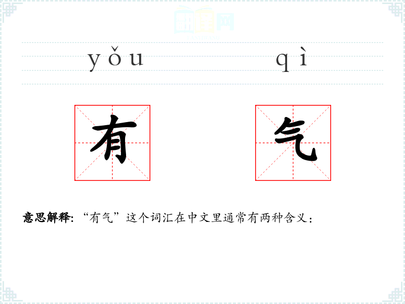 - 口语:在日常对话中,“有气”可以用来形容人的活力或情绪,如“你今天看起来很有气”。