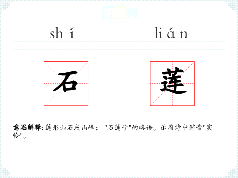 莲形山石或山峰; "石莲子"的略语。乐府诗中谐音"实怜"。