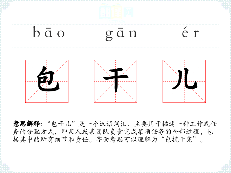 - 口语:在日常对话中,人们可能用“包干儿”来表示对某项工作的全面负责。