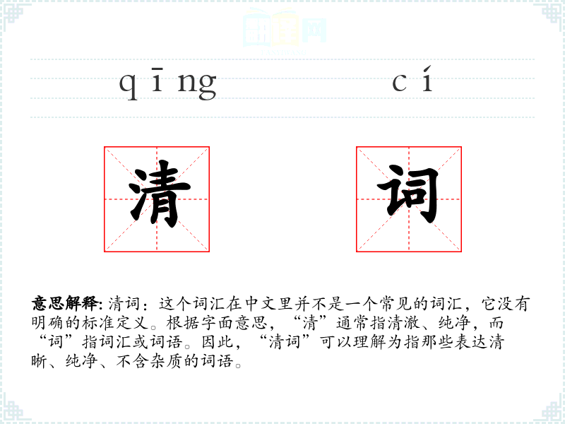 清词:这个词汇在中文里并不是一个常见的词汇,它没有明确的标准定义。根据字面意思,“清”通常指清澈、纯净,而“词”指词汇或词语。因此,“清词”可以理解为指那些表达清晰、纯净、不含杂质的词语。
