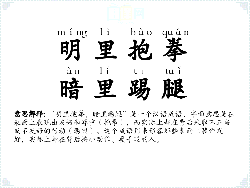 - míng lǐ bào quán,àn lǐ tī tuǐ明里抱拳,暗里踢腿