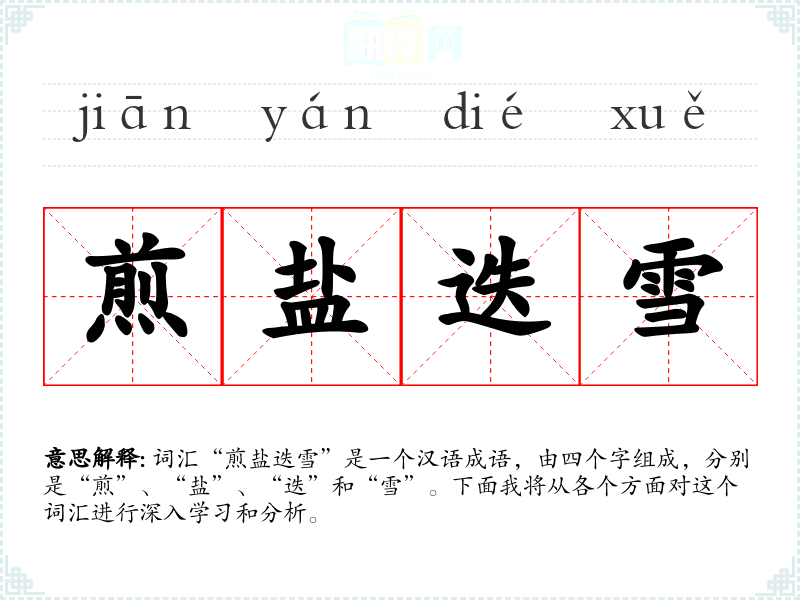 词汇“煎盐迭雪”是一个汉语成语,由四个字组成,分别是“煎”、“盐”、“迭”和“雪”。下面我将从各个方面对这个词汇进行深入学*和分析。