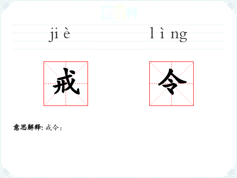 - 口语:在日常对话中,戒令可能指某人对另一人的警告或禁止,如“我妈妈对我下了戒令,不许我晚上出去。”