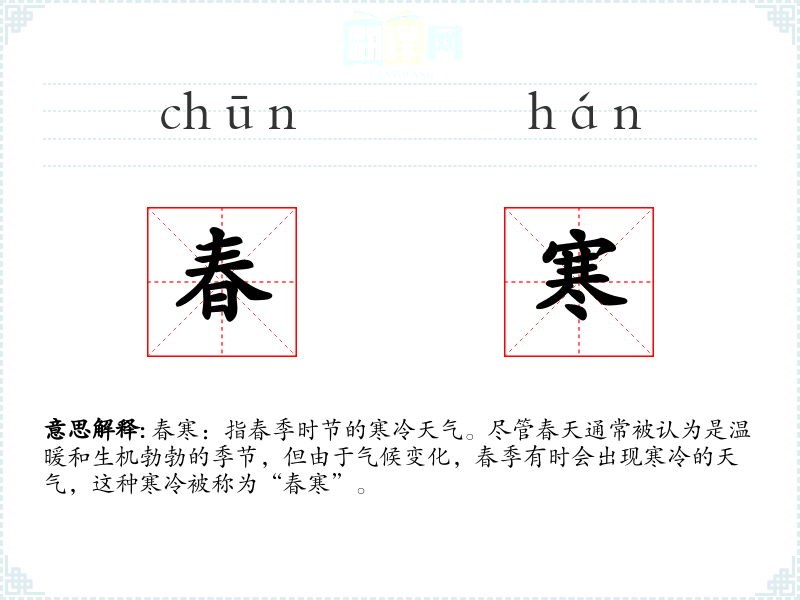 春寒:指春季时节的寒冷天气。尽管春天通常被认为是温暖和生机勃勃的季节,但由于气候变化,春季有时会出现寒冷的天气,这种寒冷被称为“春寒”。