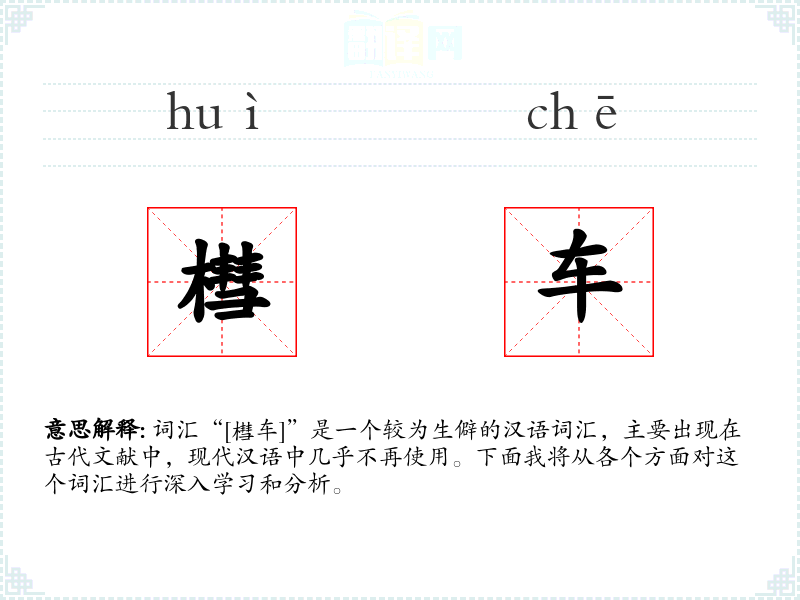 词汇“[槥车]”是一个较为生僻的汉语词汇,主要出现在古代文献中,现代汉语中几乎不再使用。下面我将从各个方面对这个词汇进行深入学*和分析。