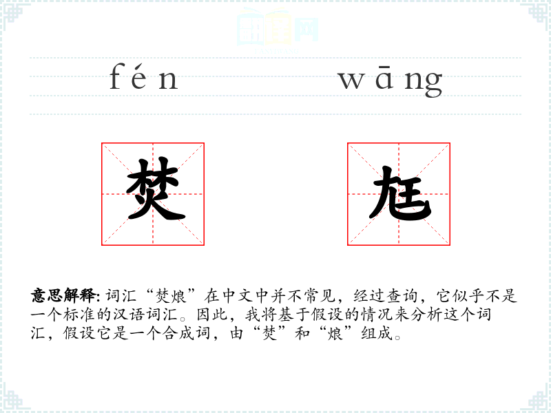 词汇“焚烺”在中文中并不常见,经过查询,它似乎不是一个标准的汉语词汇。因此,我将基于假设的情况来分析这个词汇,假设它是一个合成词,由“焚”和“烺”组成。