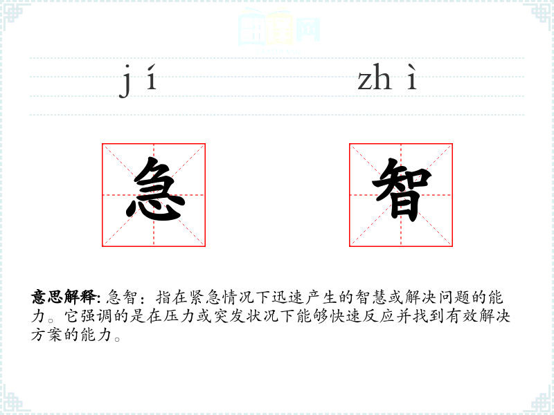 急智:指在紧急情况下迅速产生的智慧或解决问题的能力。它强调的是在压力或突发状况下能够快速反应并找到有效解决方案的能力。