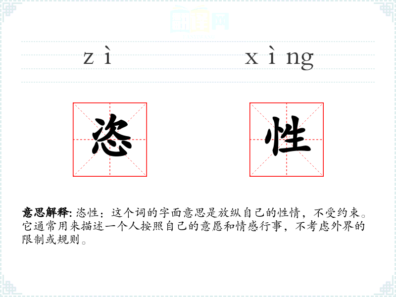 恣性:这个词的字面意思是放纵自己的性情,不受约束。它通常用来描述一个人按照自己的意愿和情感行事,不考虑外界的限制或规则。