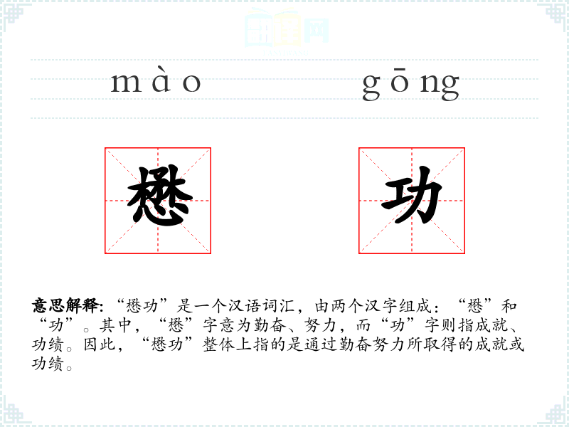 在文学作品中,“懋功”常用来形容人物的辛勤努力和显著成就,如在历史小说中描述某位将军的战功。在口语中,这个词可能不太常用,但在正式或庄重的场合,如颁奖典礼或表彰大会上,可能会用来赞扬某人的卓越贡献。在专业领域,特别是在强调个人或团队努力和成果的场合,如科研、工程项目等,也可能使用“懋功”来表达。