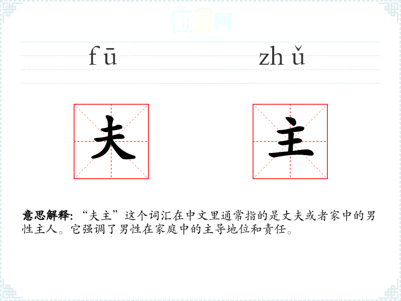 “夫主”这个词汇在中文里通常指的是丈夫或者家中的男性主人。它强调了男性在家庭中的主导地位和责任。