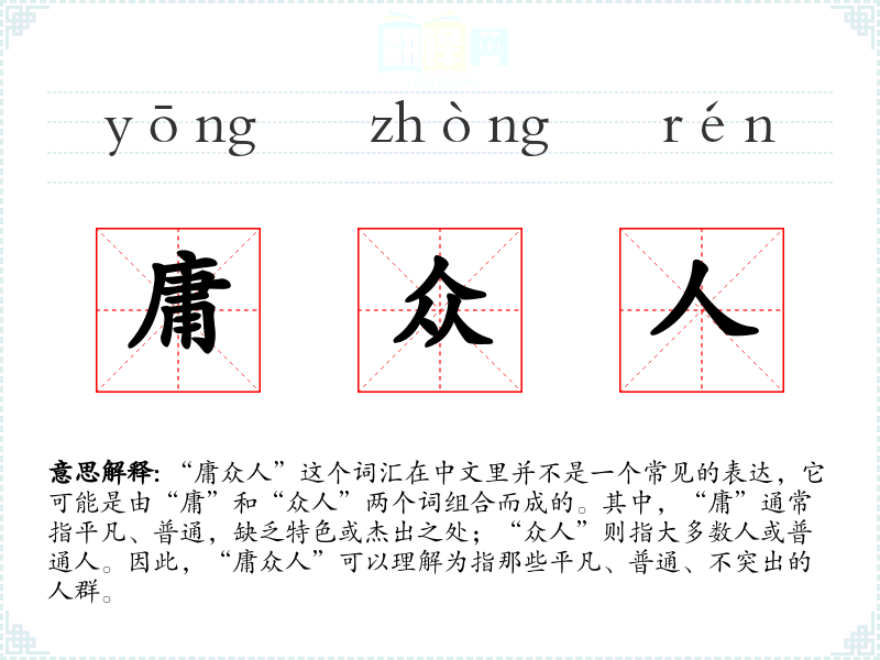 “庸众人”这个词汇在中文里并不是一个常见的表达,它可能是由“庸”和“众人”两个词组合而成的。其中,“庸”通常指平凡、普通,缺乏特色或杰出之处;“众人”则指大多数人或普通人。因此,“庸众人”可以理解为指那些平凡、普通、不突出的人群。