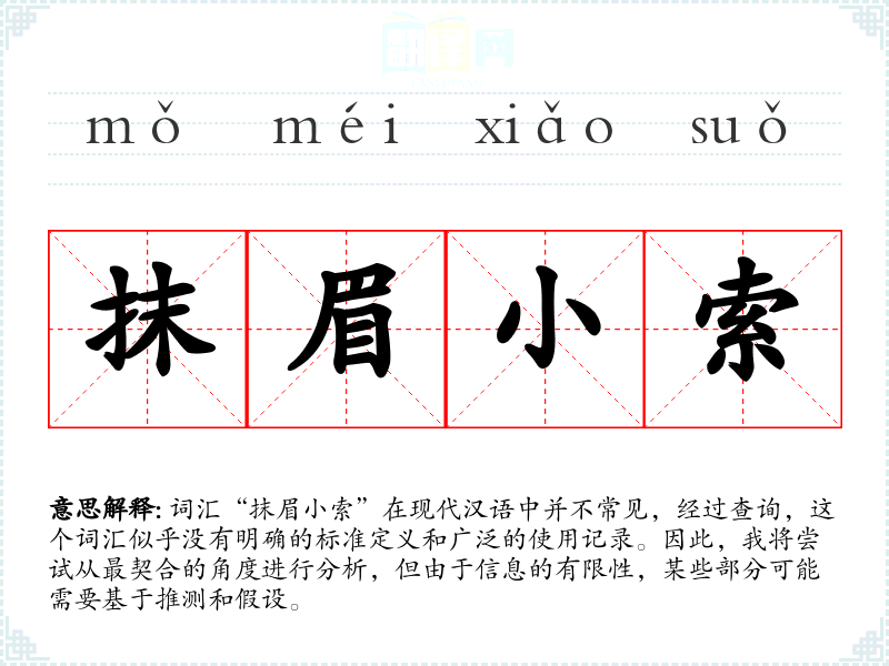 由于“抹眉小索”不是一个标准词汇,我们无法提供确切的字面意思和基本含义。它可能是某个方言词汇、古文词汇或者是某个特定领域的术语,但没有足够的资料来确定其确切含义。