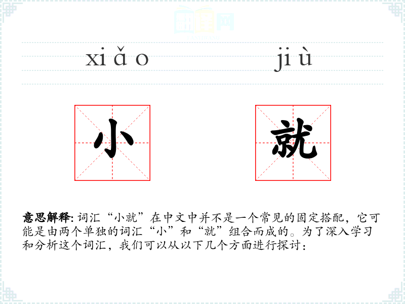 词汇“小就”在中文中并不是一个常见的固定搭配,它可能是由两个单独的词汇“小”和“就”组合而成的。为了深入学*和分析这个词汇,我们可以从以下几个方面进行探讨: