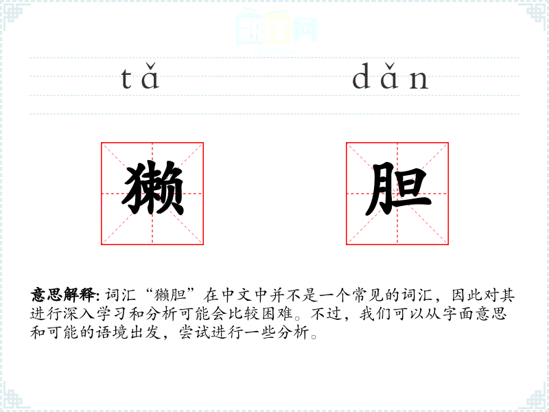 词汇“獭胆”在中文中并不是一个常见的词汇,因此对其进行深入学*和分析可能会比较困难。不过,我们可以从字面意思和可能的语境出发,尝试进行一些分析。