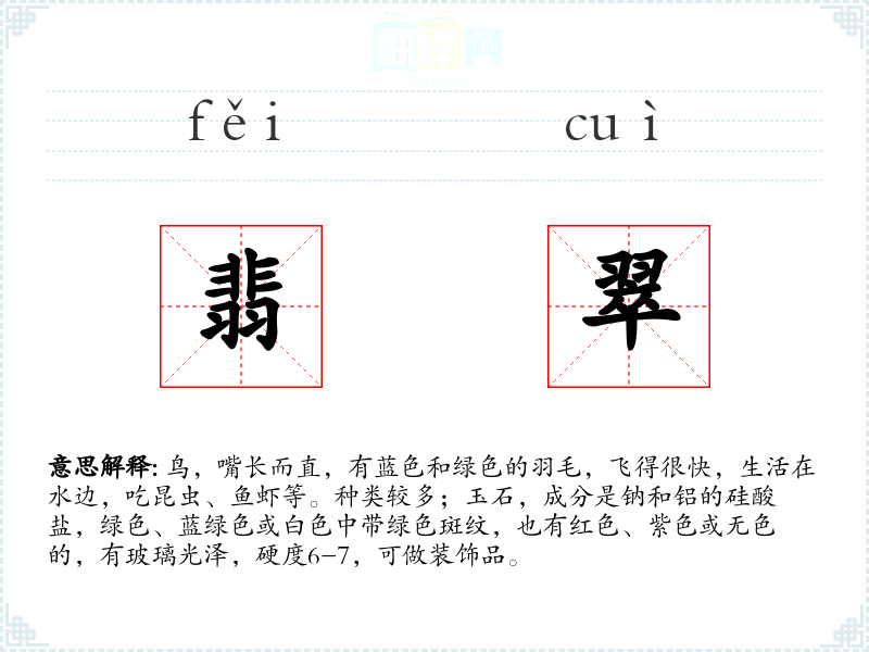 1.鸟,嘴长而直,有蓝色和绿色的羽毛,飞得很快,生活在水边,吃昆虫、鱼虾等。种类较多;玉石,成分是钠和铝的硅酸盐,绿色、蓝绿色或白色中带绿色斑纹,也有红色、紫色或无色的,有玻璃光泽,硬度6-7,可做装饰品。