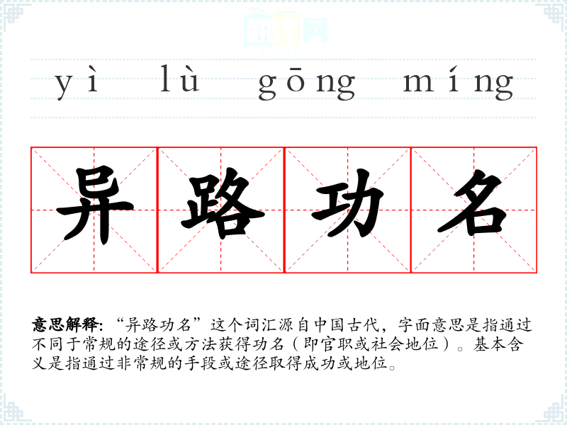 “异路功名”这个词汇的词源可以追溯到**古代的科举制度。在那个时代,大多数人通过科举考试来获得官职,但也有一些人通过其他途径,如推荐、捐官等方式获得功名。随着时间的推移,这个词汇的含义逐渐扩展,用来描述任何通过非常规手段取得成功的情况。