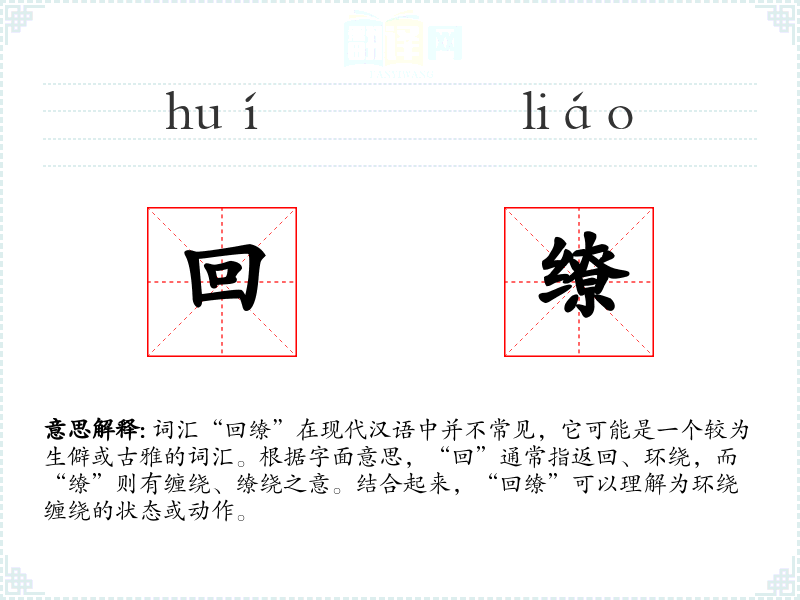 “回缭”的字面意思和基本含义是指某物或某动作环绕、缠绕、缭绕的状态或过程。