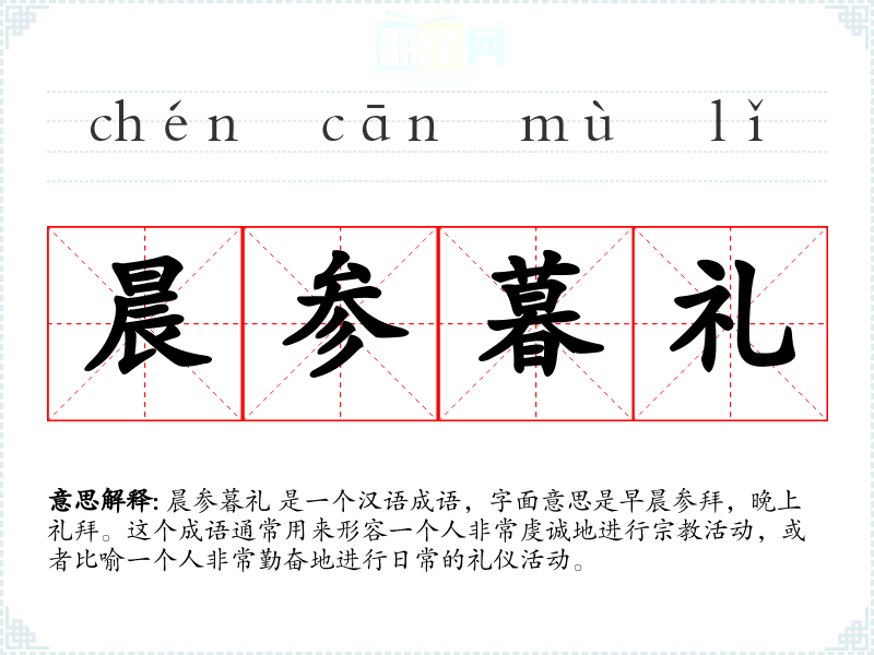 晨参暮礼 是一个汉语成语,字面意思是早晨参拜,晚上礼拜。这个成语通常用来形容一个人非常虔诚地进行**活动,或者比喻一个人非常勤奋地进行日常的礼仪活动。