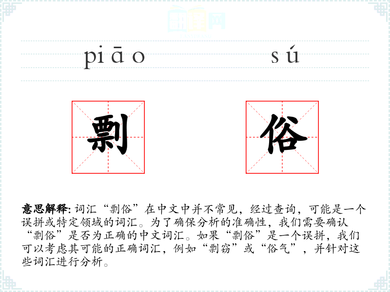 词汇“剽俗”在中文中并不常见,经过查询,可能是一个误拼或特定领域的词汇。为了确保分析的准确性,我们需要确认“剽俗”是否为正确的中文词汇。如果“剽俗”是一个误拼,我们可以考虑其可能的正确词汇,例如“剽窃”或“俗气”,并针对这些词汇进行分析。